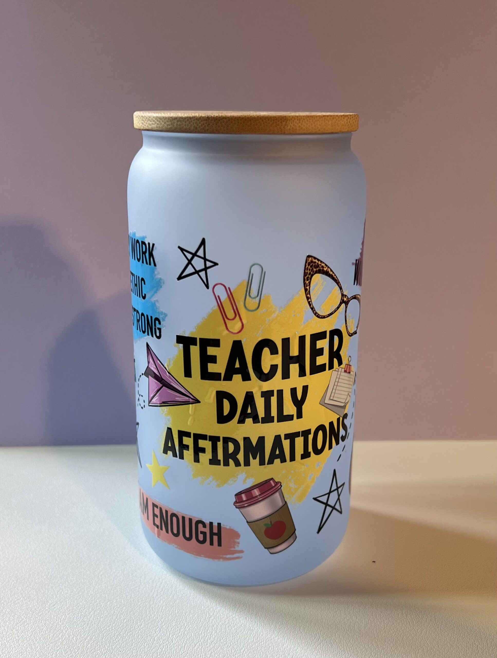 16oz. Glass Color Changer Cup with Bamboo Lid- Teacher Daily Affirmations
