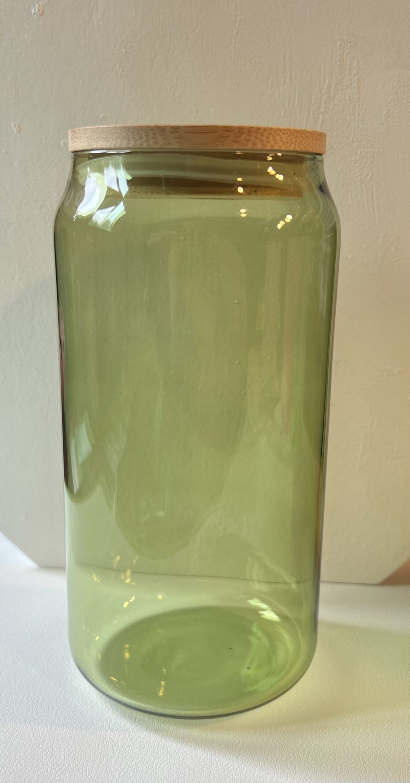 16oz. Green tinted Glass cup with straw and Bamboo lid. Pick a wrap or decal