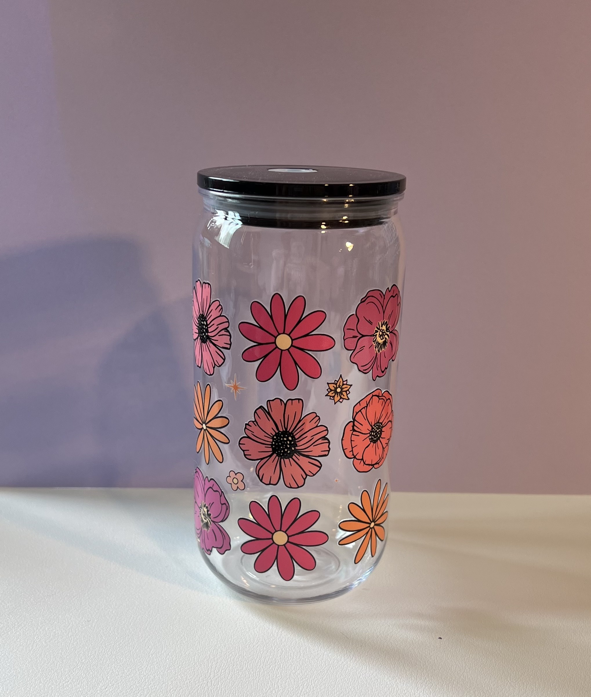 16oz. Plastic Cup with Black Lid- Pink Flowers