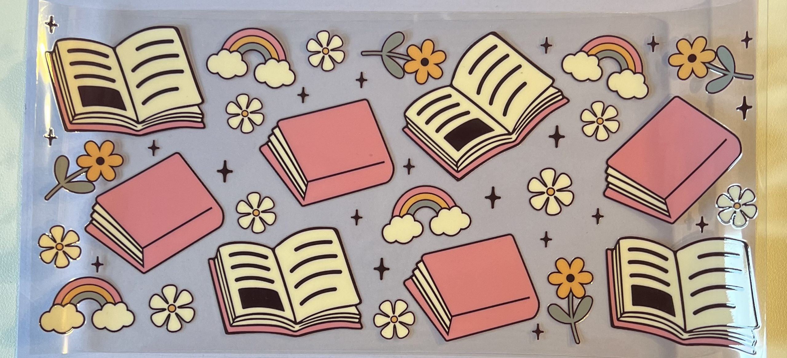 Book Theme- This is a 40oz. Wrap – Books, flowers, and rainbows.