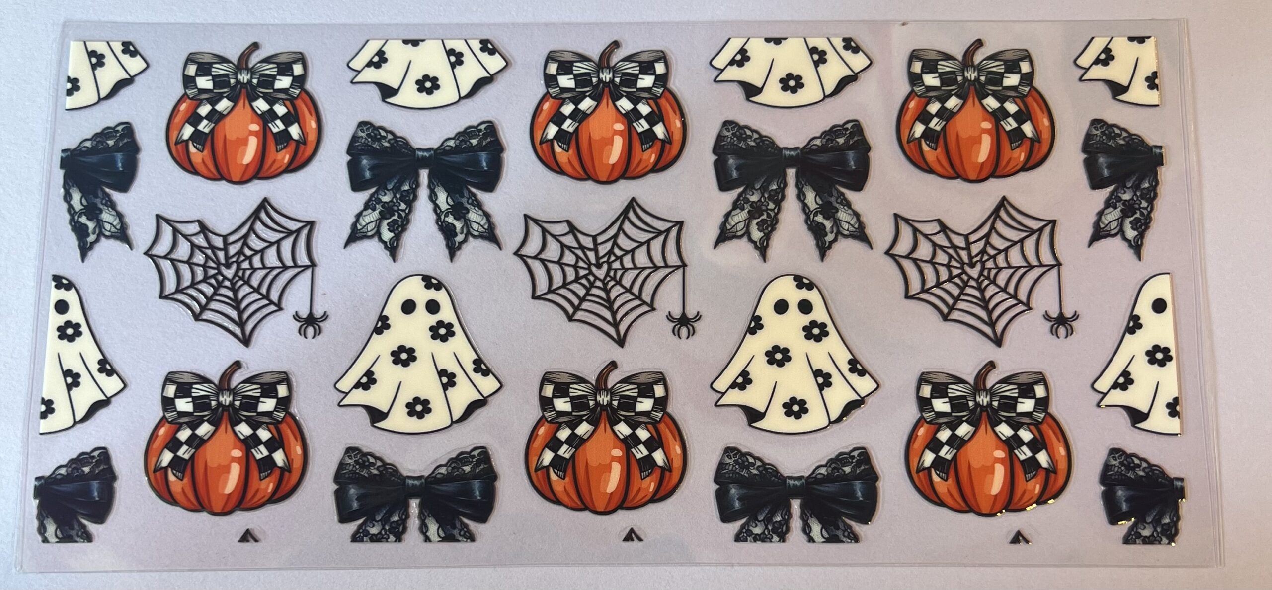 Halloween Theme-White Ghost with Black Flowers, Checkered Pumpkin Bows and spider webs
